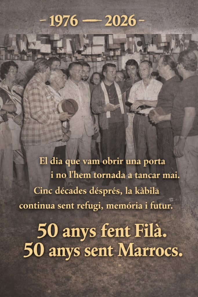 El dissabte 21 de febrer de 2026, la Filà Marrocs tornarà a eixir al carrer per celebrar el Mig Any 🎉, però no serà un Mig Any qualsevol: commemorem els 50 anys de la inauguració de la nostra kàbila 🏠✨.